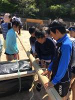 今日の昼休みは、「全校遊びの日」です。全校児童が、みんなで「バナナおに」をしています。 ※ 逃げろ~!(白ぼうしの人)