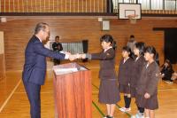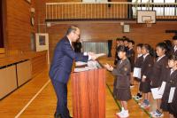 今朝の朝会は、「うしお入選、今治市越智郡小中学生書道展入賞、校内持久走大会記録賞、ミニ駅伝記録賞」の表彰がありました。おめでとうございました。